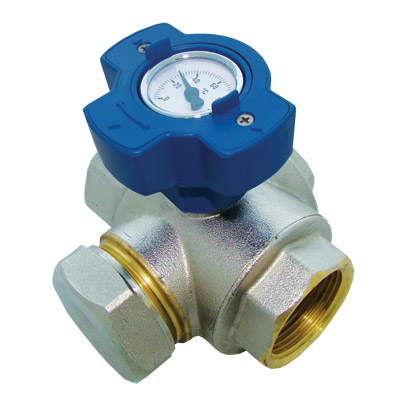 Мултифункционален топчест вентил со сина рачка. Термометар од 0–120 °C.