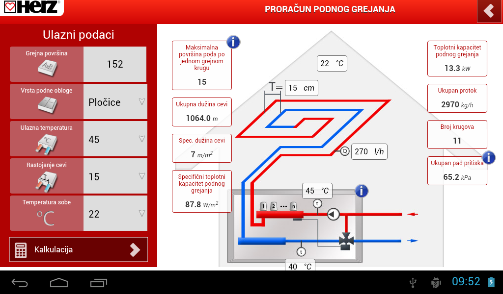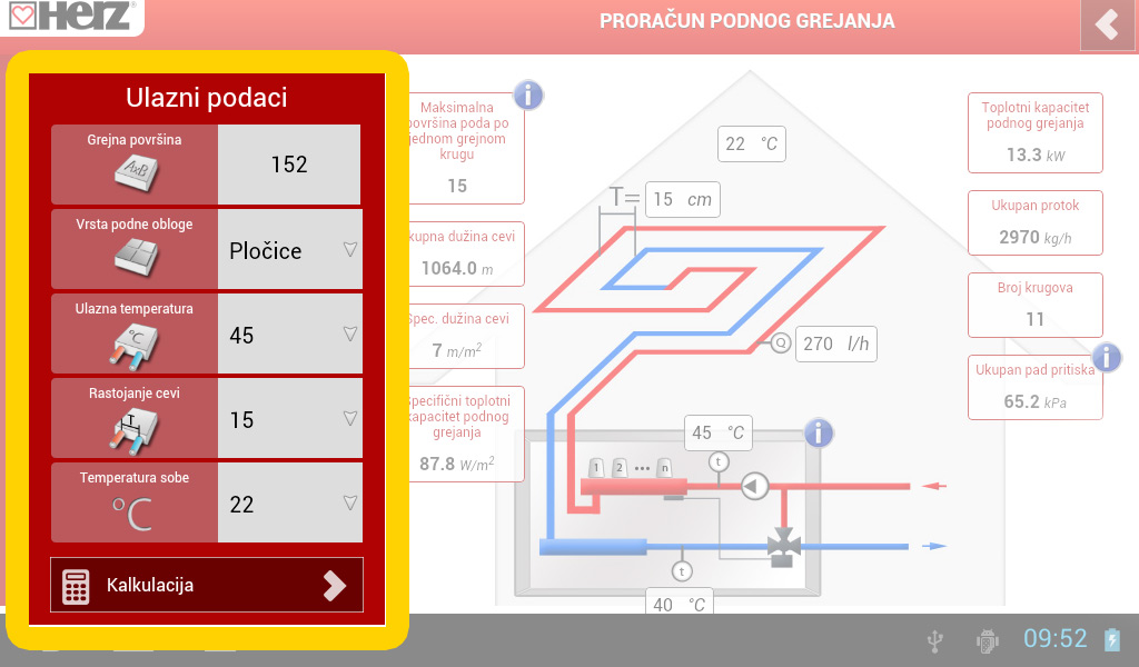 Врз основа на овие влезни податоци, HERZ FH ја пресметува максималната површина на подот која е можно да се опфати со едно грејно коло (должина на цевки до 100 метри), вкупната потребна должина на цевките за целата грејна површина, вкупниот број на грејни кола поради изборот на разделници и собирници.