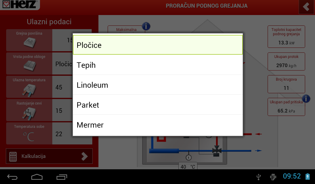 Како најважни податоци, ги добиваме топлинскиот капацитет на подното греење, вкупниот проток и падот на притисок поради изборот на пумпата. Сите влезни параметри може да се менуваат со цел да се добијат потребните излезни параметри. Со добиените излезни параметри не се надминуваат физиолошки дозволените температури на подот.